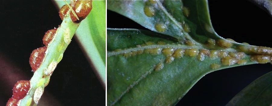 Cochonilha com escama – São insetos sugadores e parecem pequenas verrugas de 3-5 mm aderidas nos ramos novos e folhas, onde a condução de seiva é maior. Por extraírem toda seiva da planta, esta vai definhando podendo rápidamente morrer.
