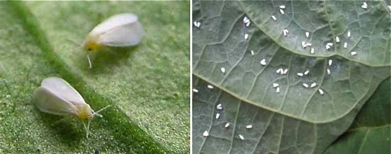 Mosca branca – É um inseto muito pequeno, medindo de 1-2 milímetros e tem coloração de branca a amarelo-pálido, os olhos são negros e se destacam no corpo do inseto. Quando está em repouso, mantém as asas fechadas, parecendo haver um par somente. Tecnicamente não se trata de uma mosca, pois é um hemíptero, mesma ordem dos pulgões e percevejos.